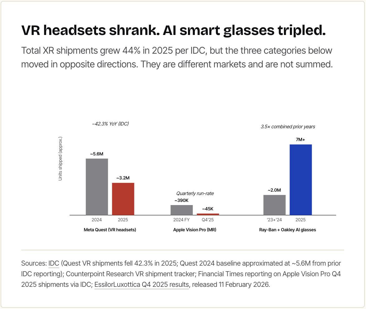 IDC reported Meta's Quest VR headset line shipped 42.3% fewer units in 2025 than in 2024 even as Meta cut prices. Apple's Vision Pro, the device that was supposed to validate the premium consumer end of the market, shipped on the order of 390,000 units across its entire 2024 launch year and an estimated 45,000 units in the fourth quarter of 2025 per IDC figures. Meta laid off more than 1,000 Reality Labs employees in January 2026, shut down VR studios, and pushed Horizon Worlds toward mobile.