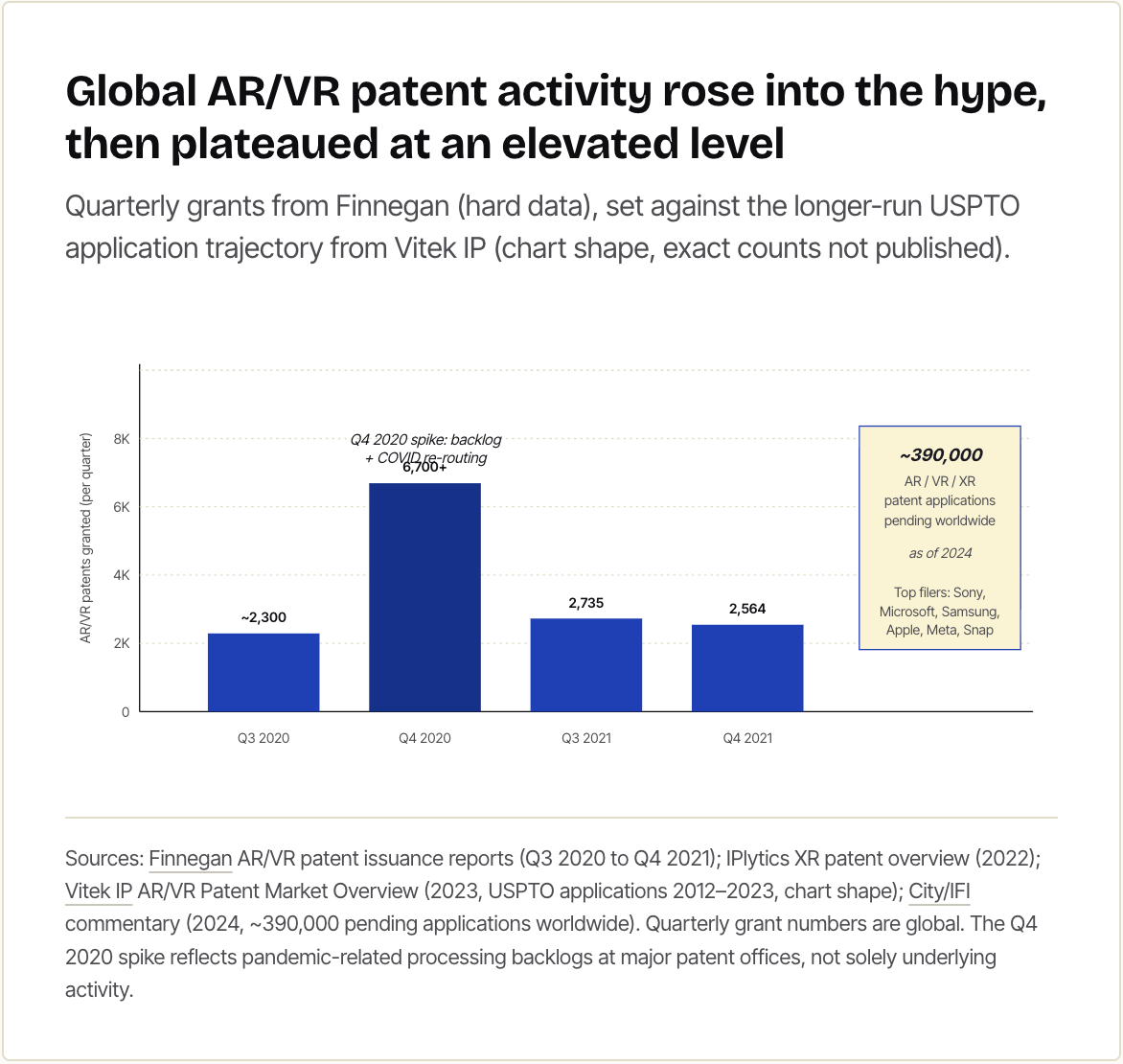The Vitek IP USPTO chart shows AR/VR application volumes climbing from below 1,000 in the early 2010s to between 3,000 and 4,000 a year by the early 2020s, then leveling off. Henry.law's 2024 overview describes the same shape. A leveling-off, not a collapse. The category ran its filing surge into the metaverse hype window and then settled at a much higher baseline than it had pre-2015.